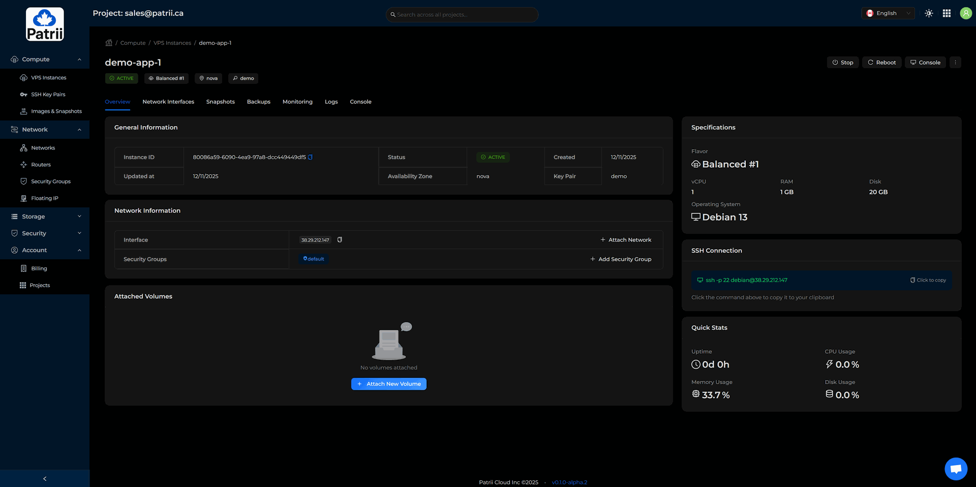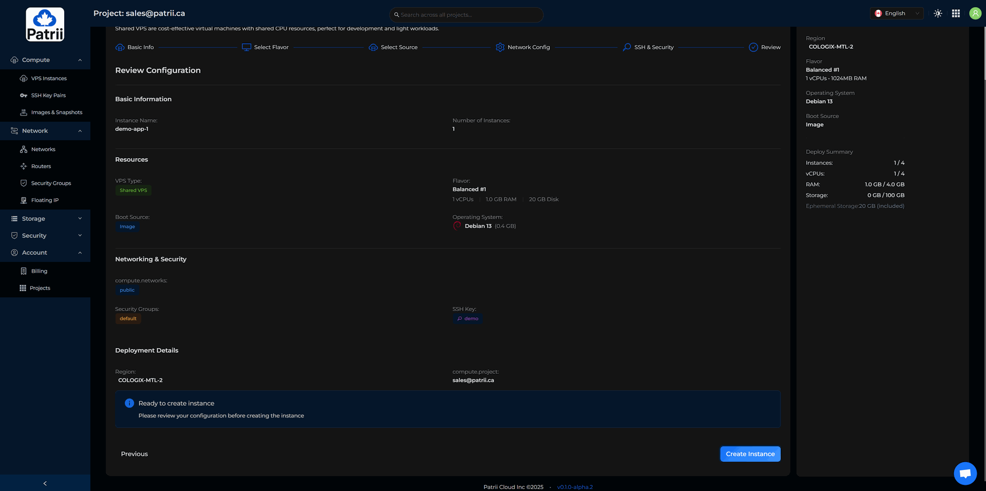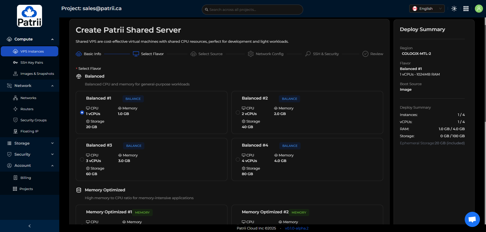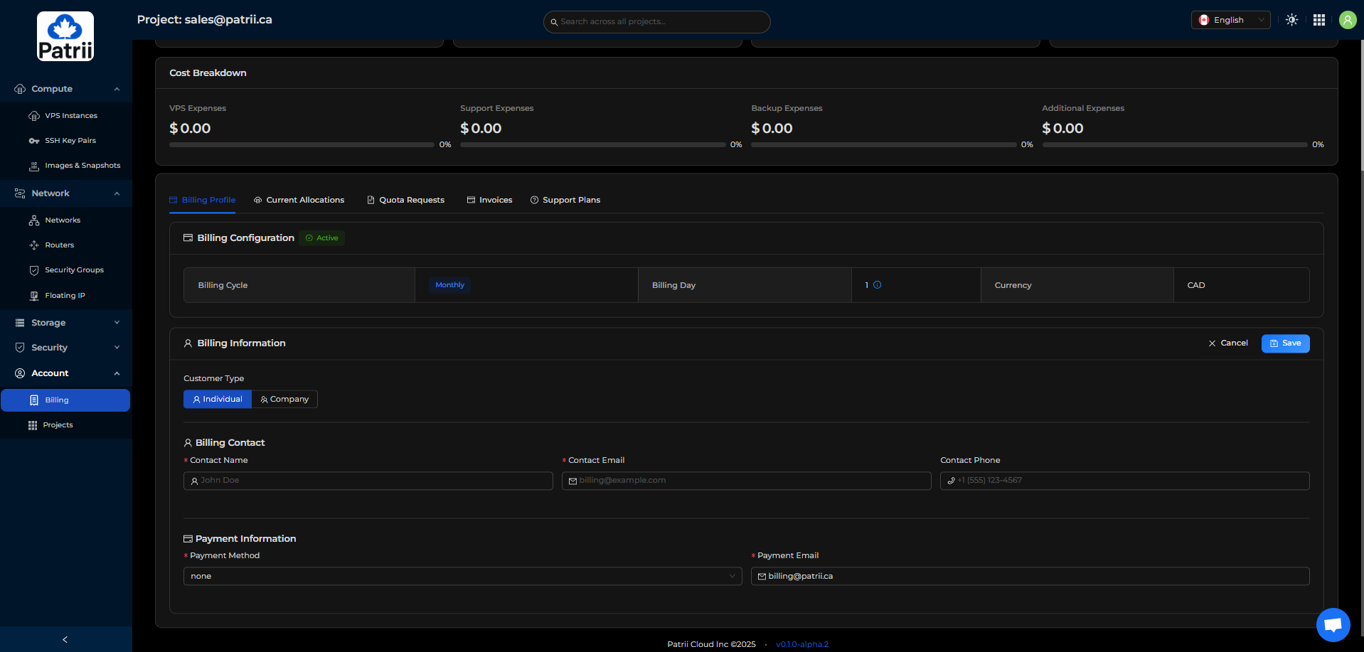 Patrii Cloud uses prepaid quota during alpha so you can reserve the monthly resources you plan to use.
