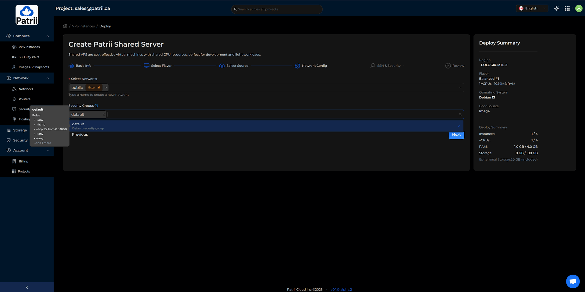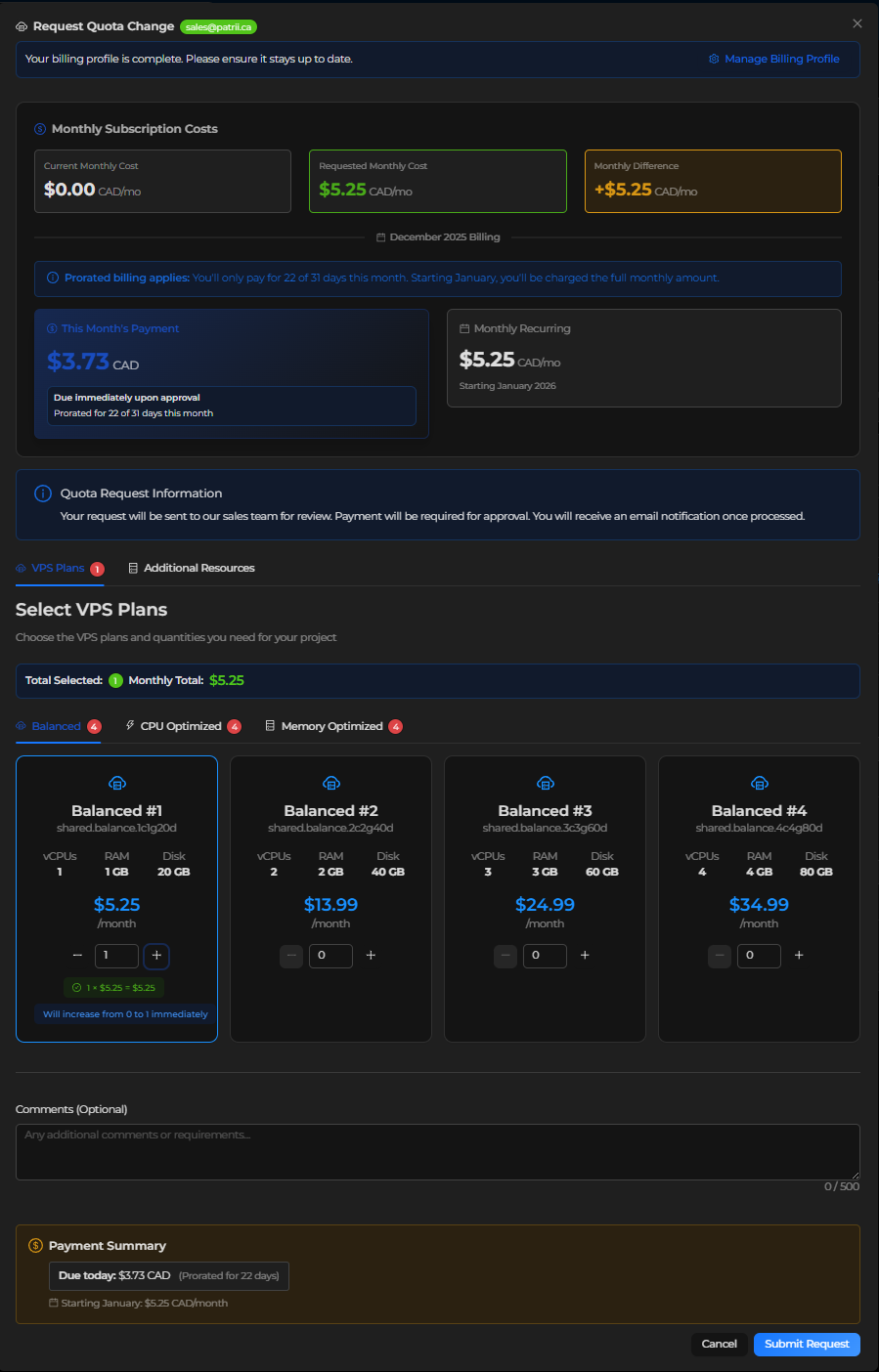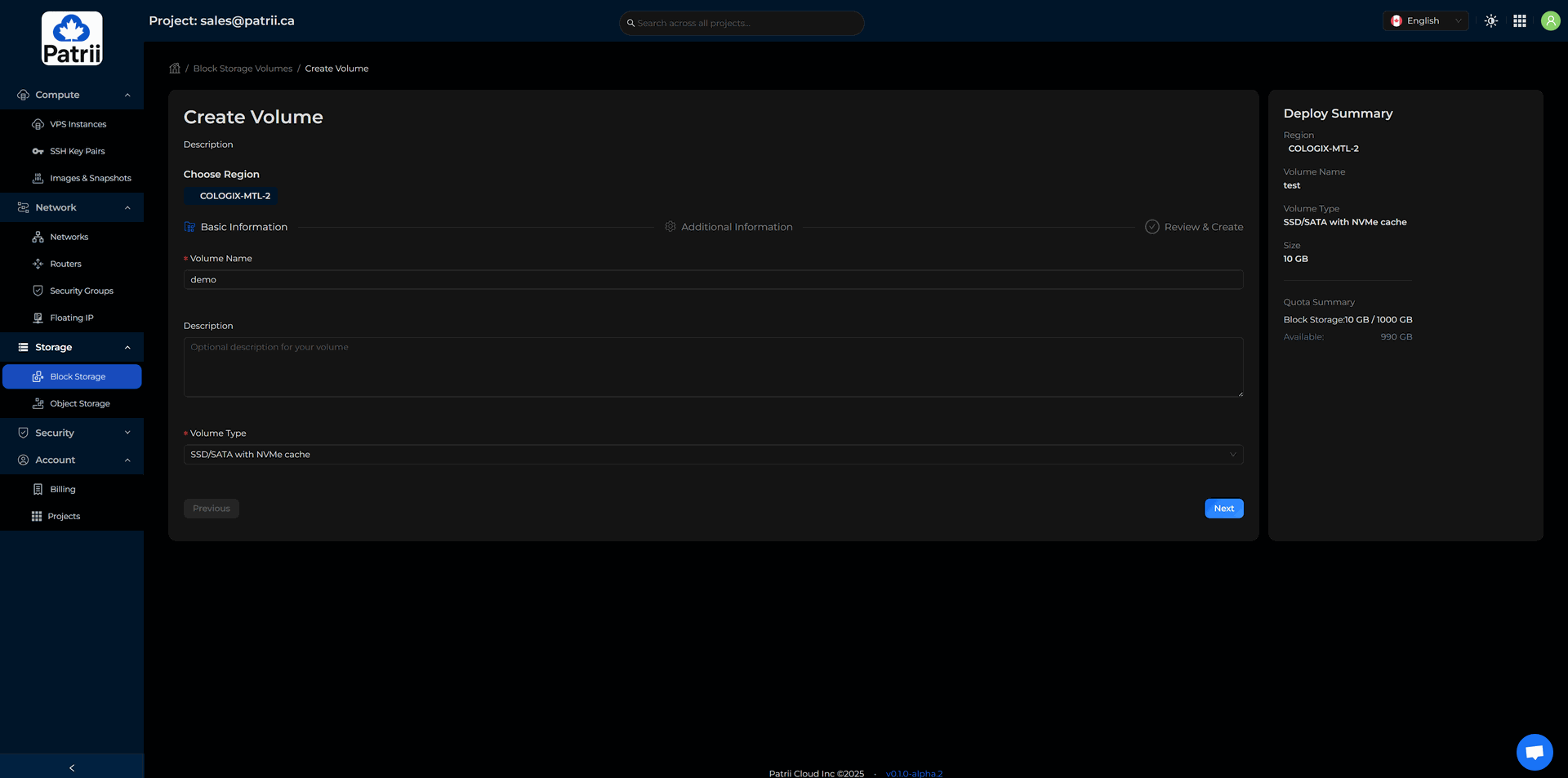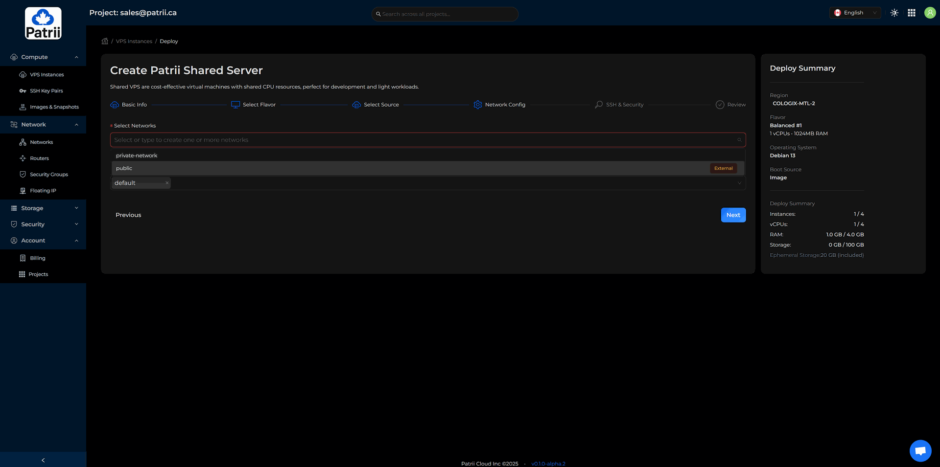 Patrii Cloud uses prepaid quota during alpha so you can reserve the monthly resources you plan to use.