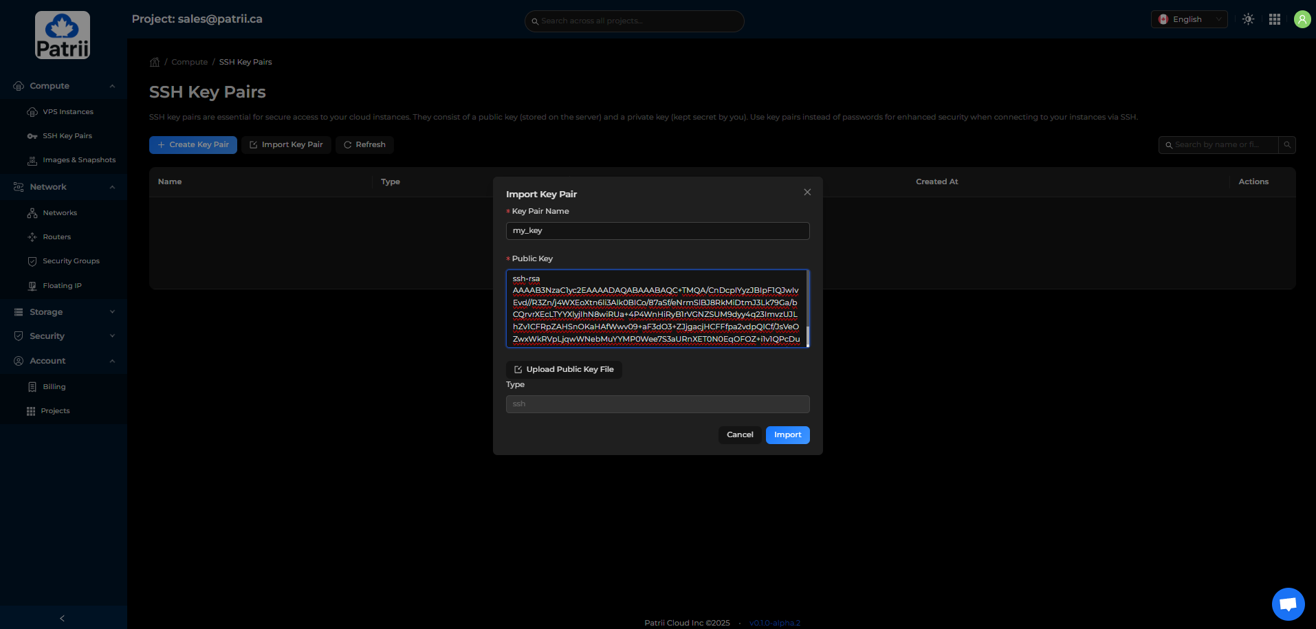 Compute → SSH Key Pairs → Import Key Pair