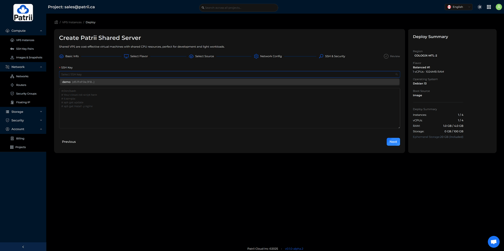 Patrii Cloud requires at least one SSH key before creating a VPS.