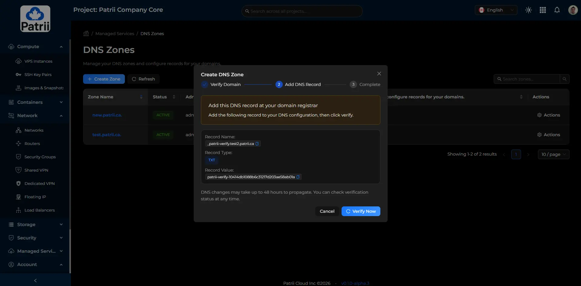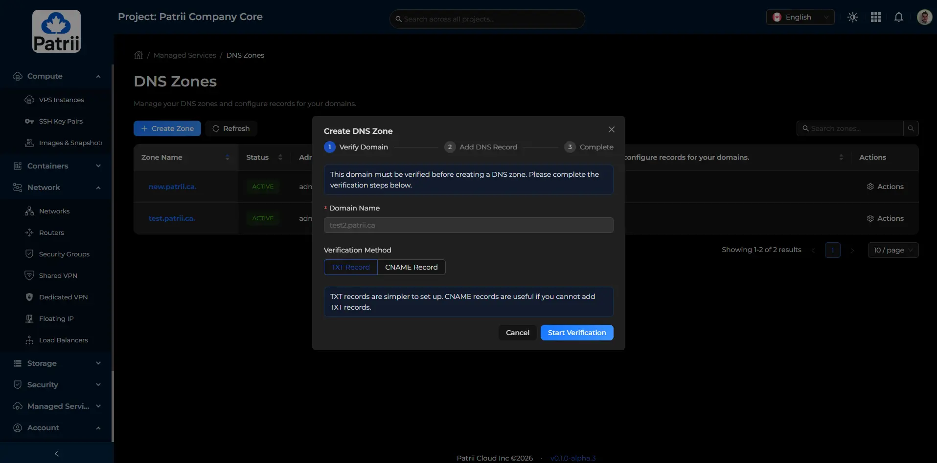 When creating a new DNS zone, Patrii guides you through domain ownership verification.