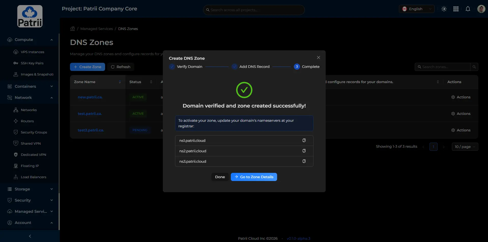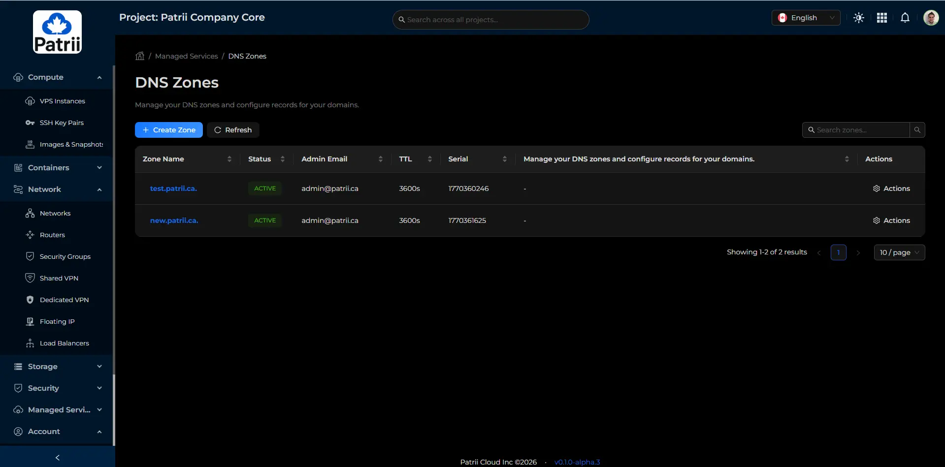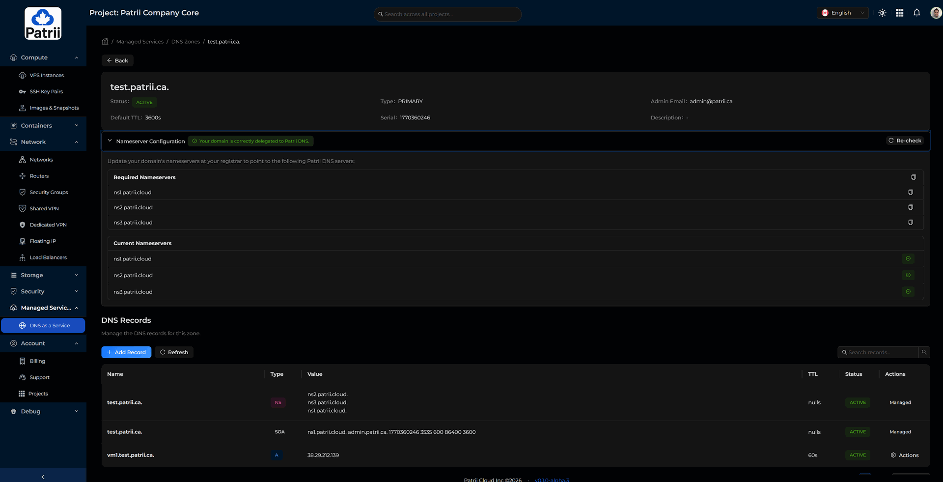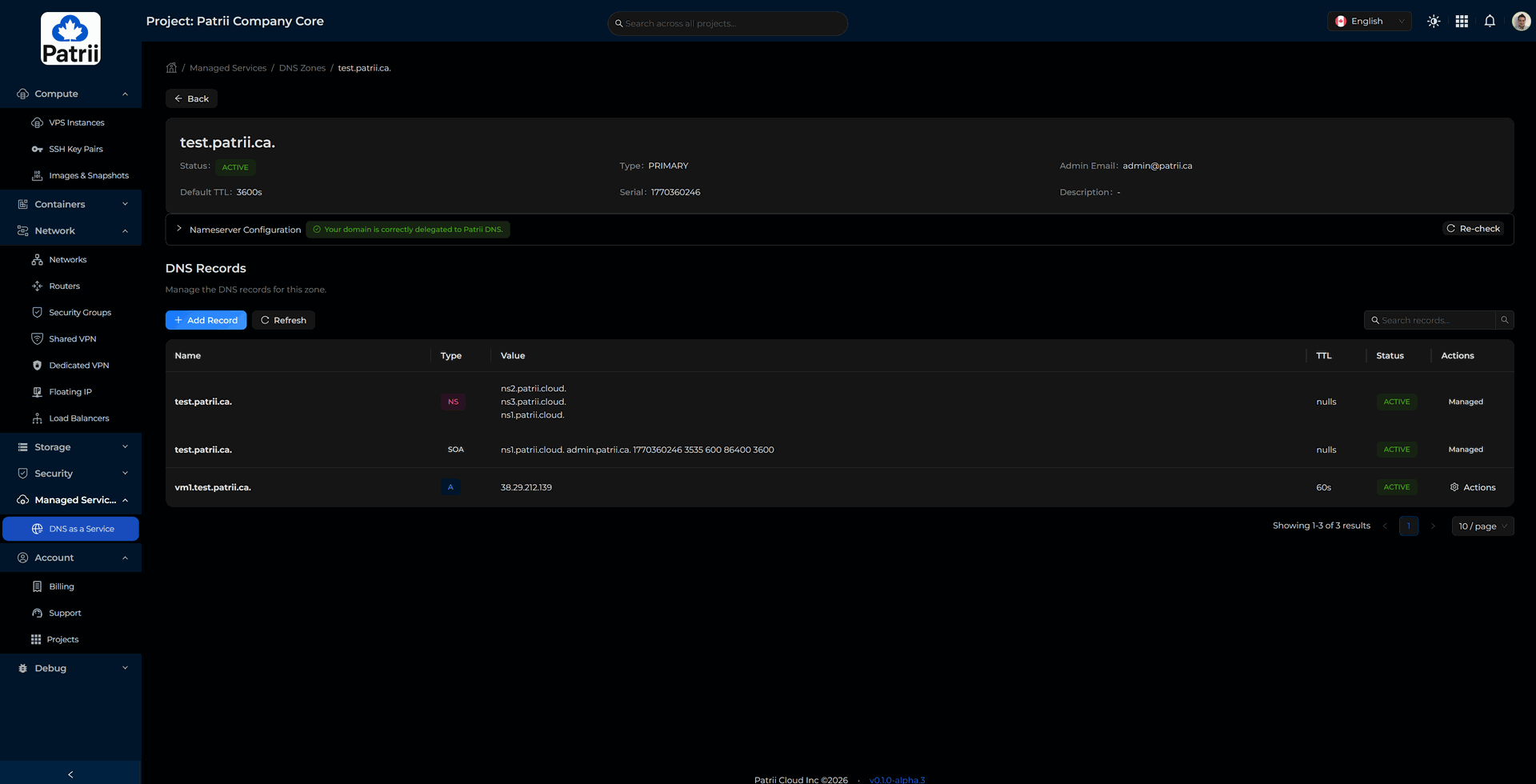 DNS is a native managed service, integrated directly into the Patrii Cloud platform alongside compute, storage, networking, and load balancers.